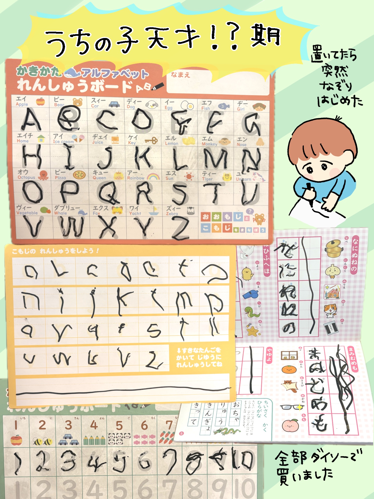 いつかやってくれるかな〜と思いながらその辺に置いていた練習帳(アルファベット、数字、ひらがな)をいつの間にかやってました。