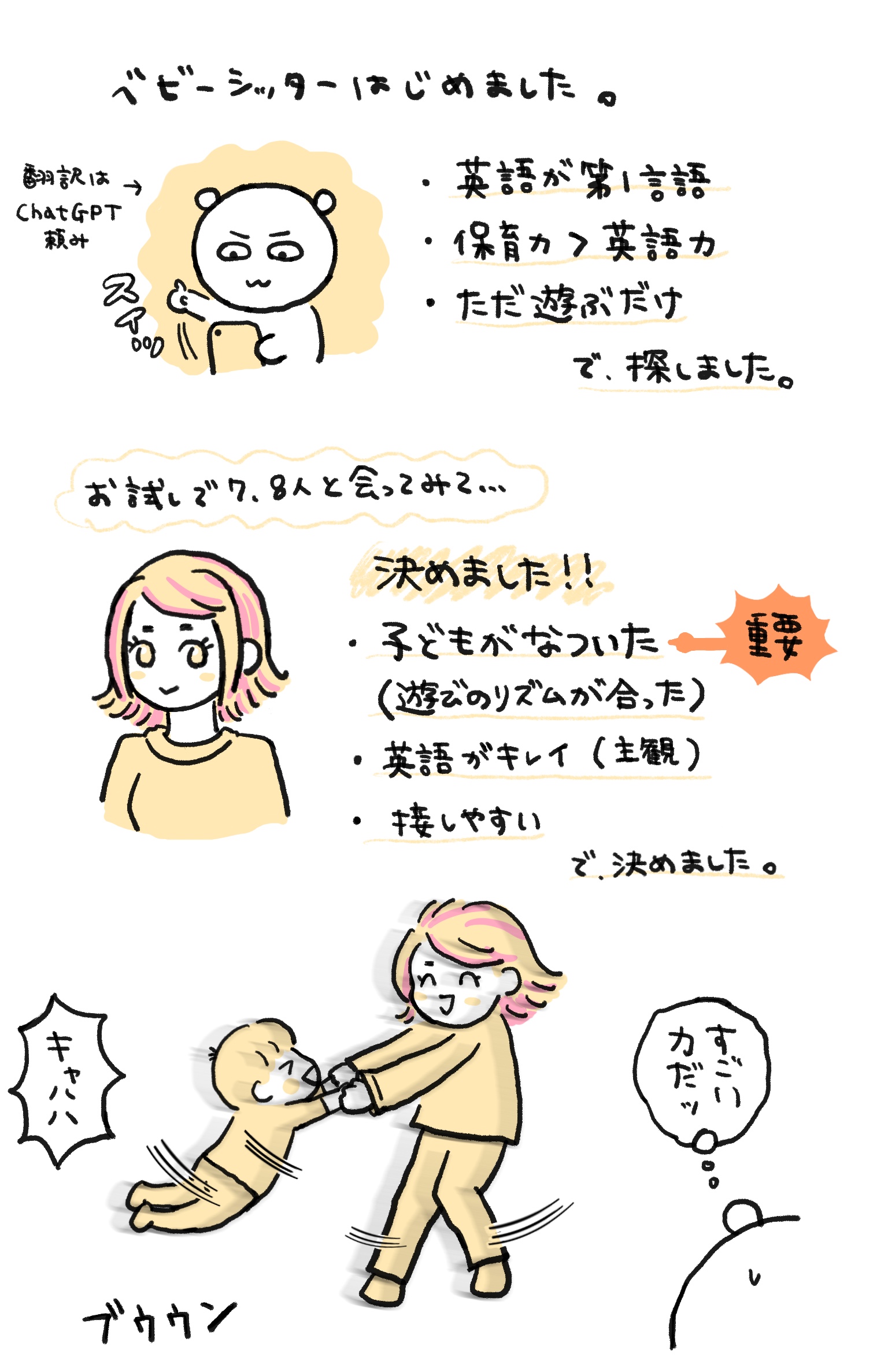 何回か会ってみて、子どもが「あの人は今日来るの?」と聞いてきた人を継続雇用することにしました。