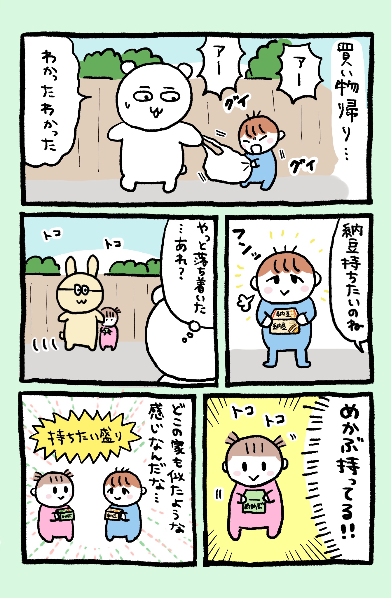 ある日、いつものように納豆パックを持たせて帰り道を歩いていると、向かいから同じくらいの歳の子が歩いてきました。