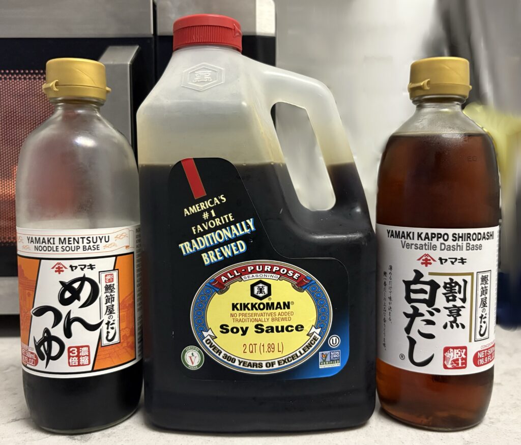めんつゆ、醤油(なんかめっちゃ大きい)、白だし!