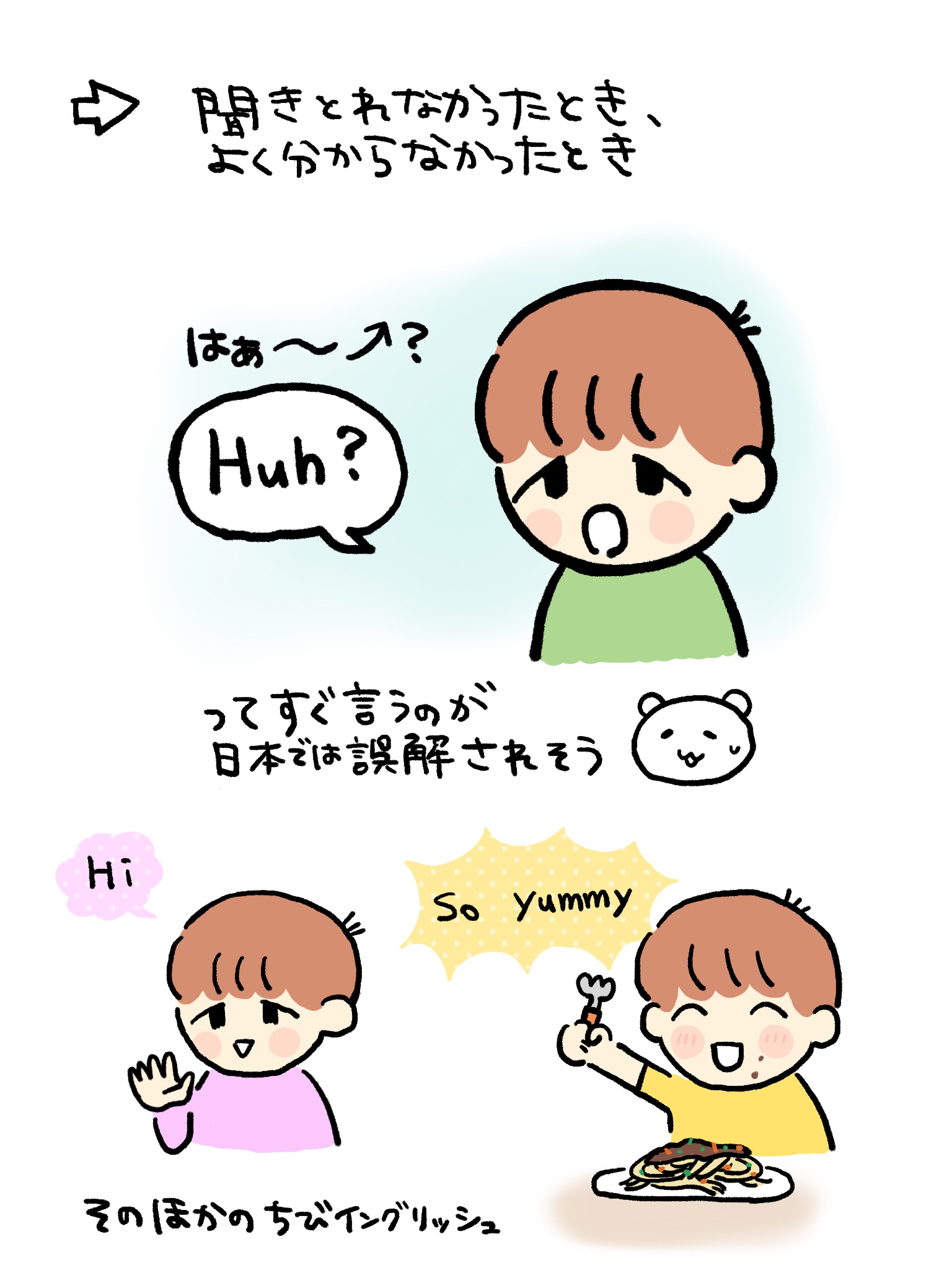 基本は日本語なのですが、「おっと!」や「えっ?」みたいな言葉を英語で言います。