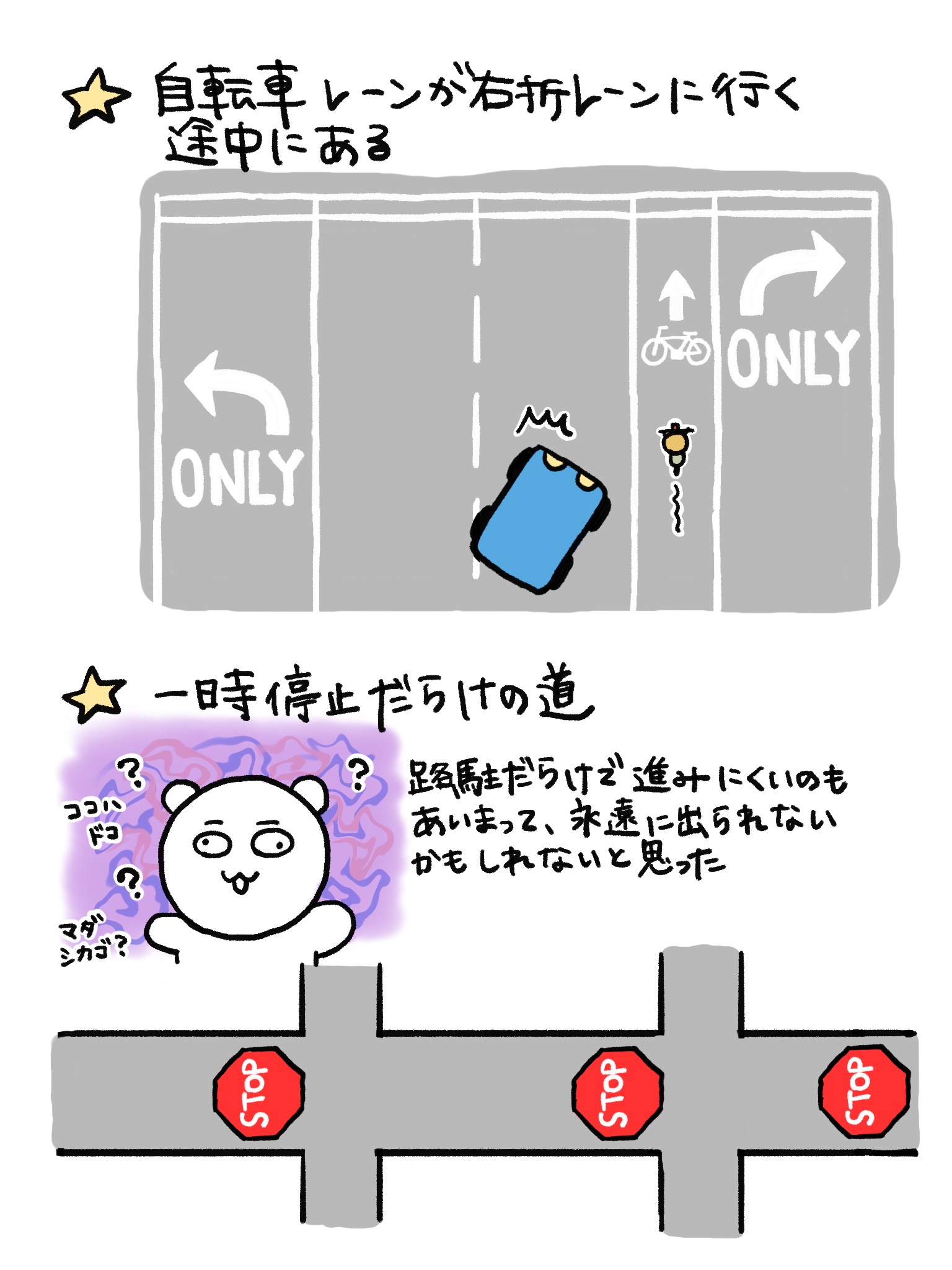 右折レーンに入るために自転車レーンまたいで行くのもなかなか不思議でした。