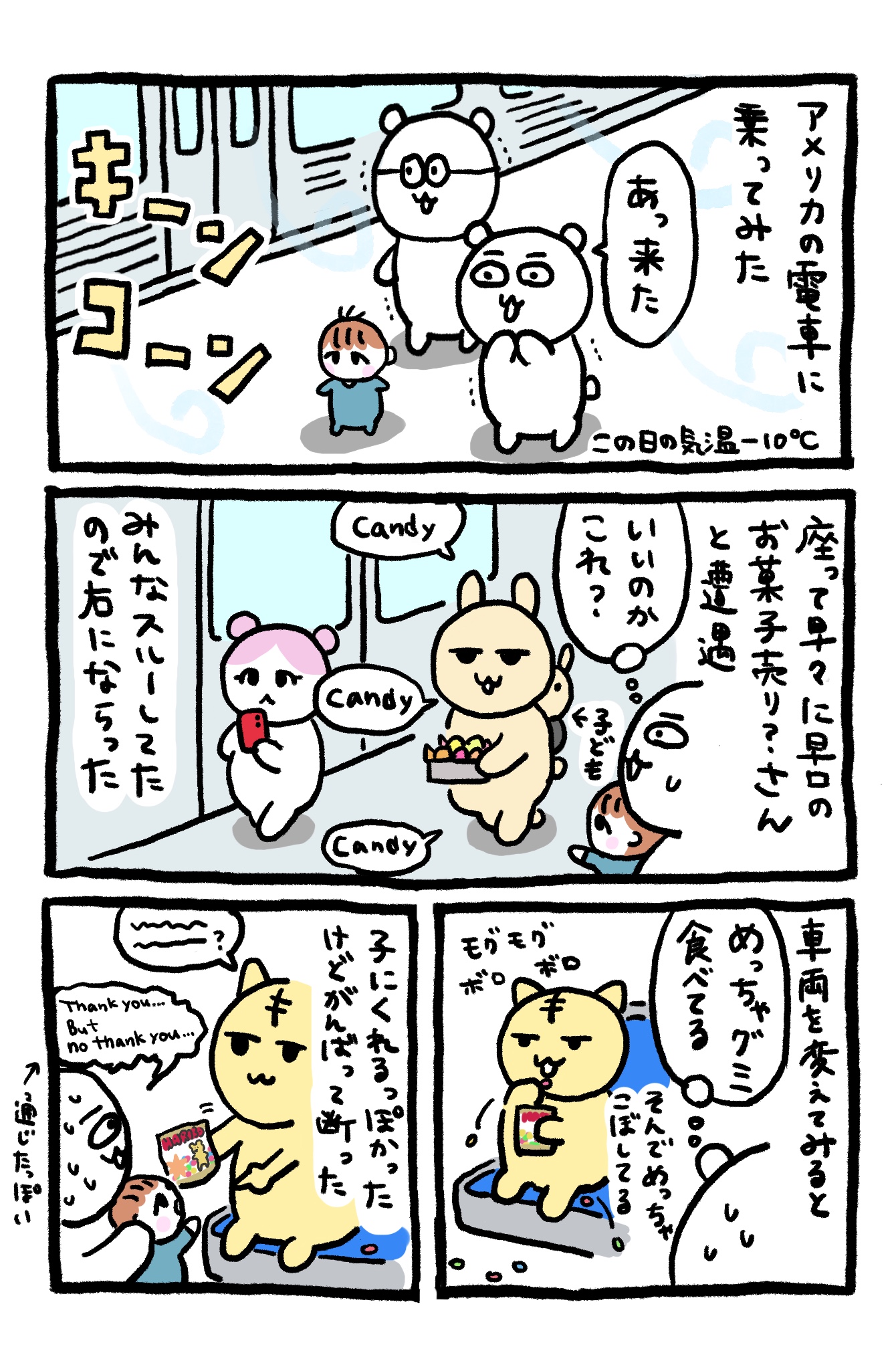 小さい子供を背負った女性が「candy candy candy」と早口で言いながらいろんなお菓子の入った小箱を乗客に向けながら歩いてました。