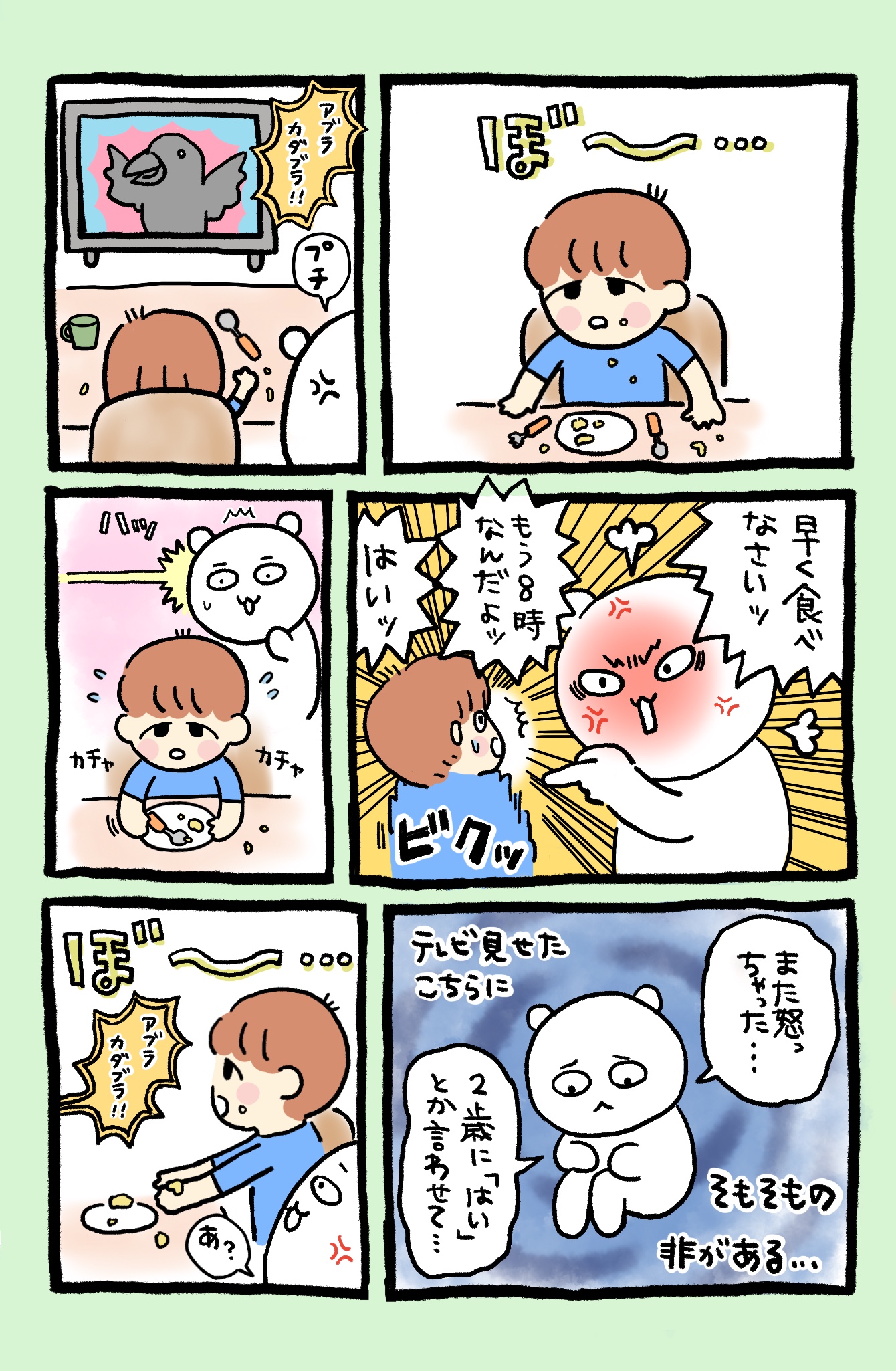 「早く食べなさい!」と強く言ってしまうこともあるのですが、そもそも動画を見せてることが問題なんだよなあ……