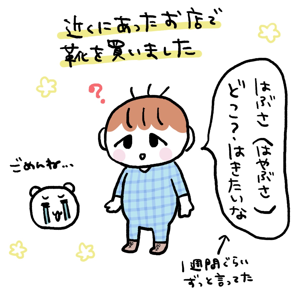 起きた子どもは新しい靴を受け入れつつも「はぶさは?はぶさどこ?はきたいな」と言い、1週間ぐらい事あるごとに「はぶさどこ?」と言っててほんと申し訳なかったです。