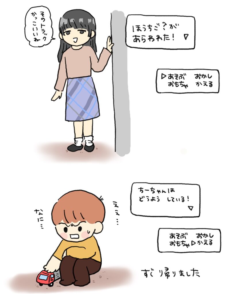 歳が離れすぎて遊びづらいちーちゃんに声をかけたり、ちーちゃんではなく私を見ていたり、わざと危ないことをして気を引こうとしたり。
