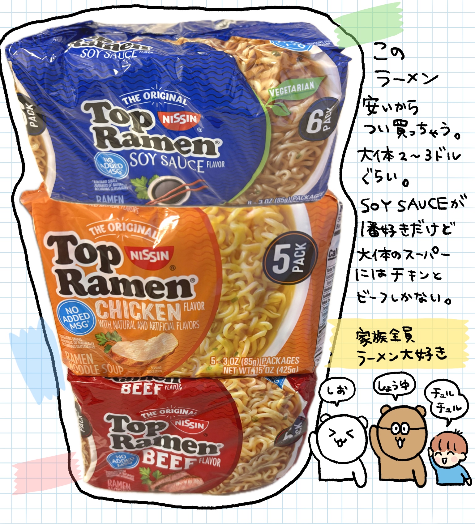 我が家では手軽に買える日清のTop Ramenを常備してます。