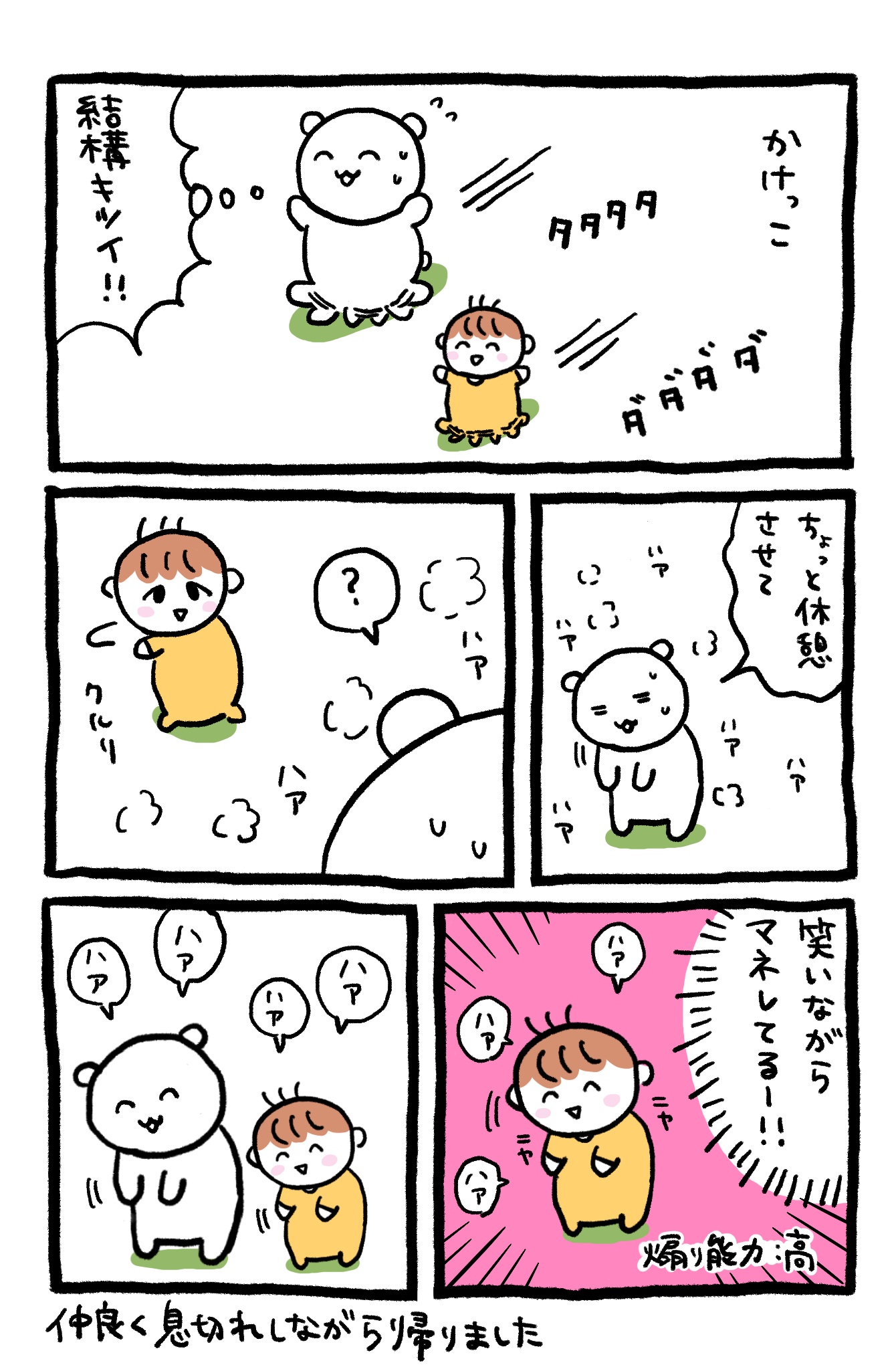 かけっこして疲れて手をついてハアハア言ってたら子どもも立ち止まって真似してきました。