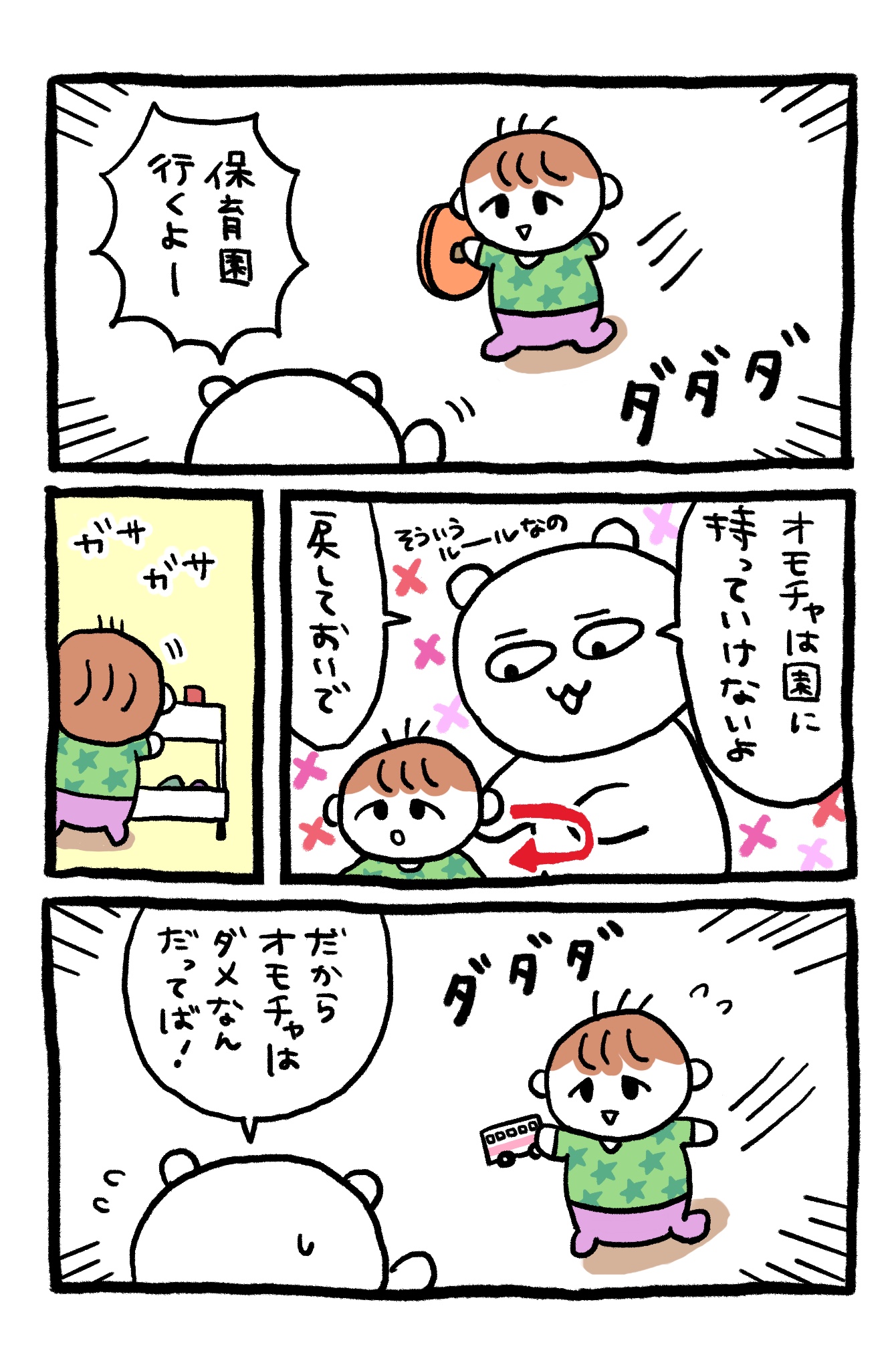 おもちゃを保育園に持って行こうとするので戻してくるよう促したら違うおもちゃ持ってきました。