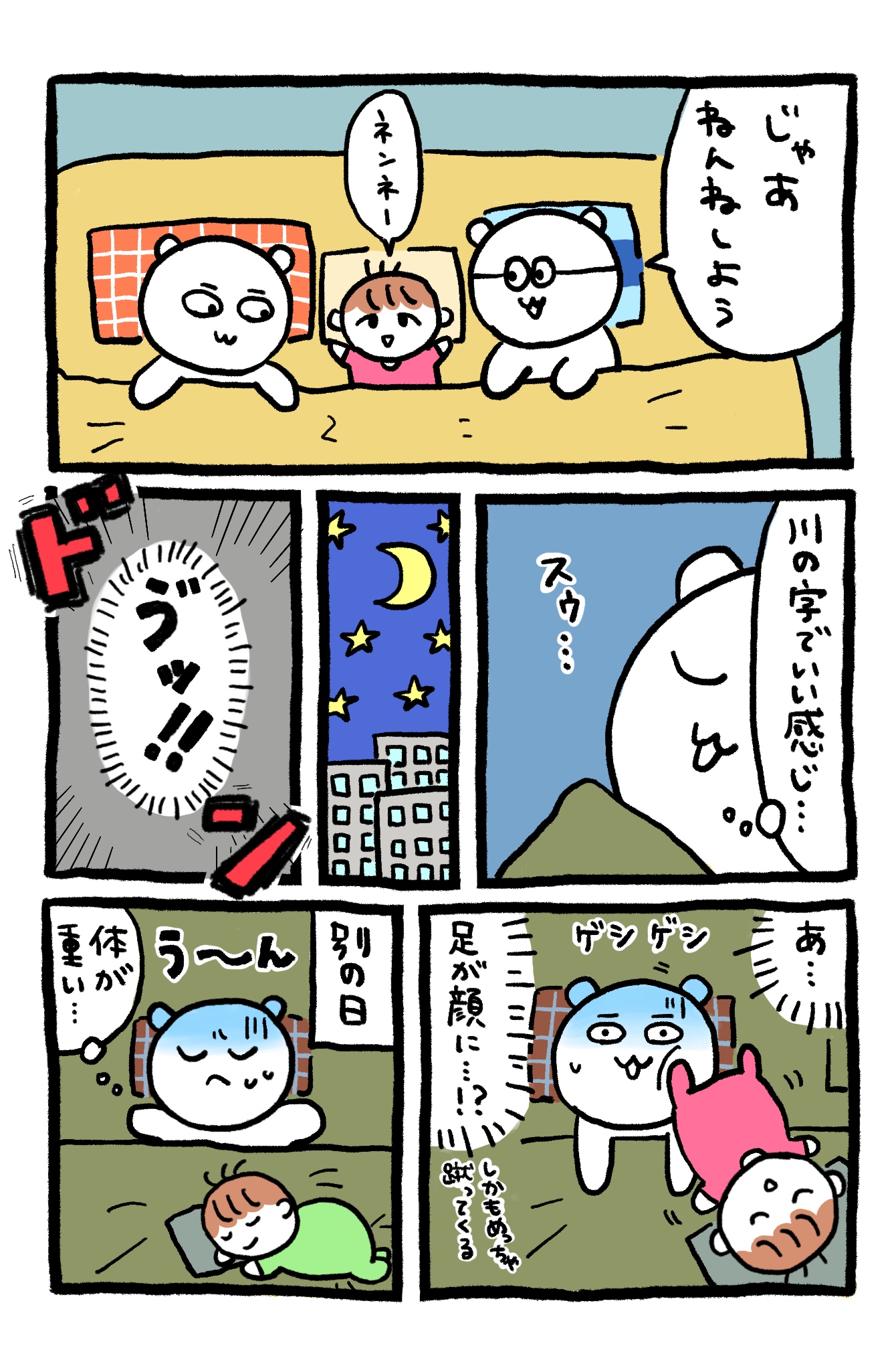 最近は夜泣きもほとんどなく、川の字で寝てるのですが、とにかく子どもの寝相がすごいです!