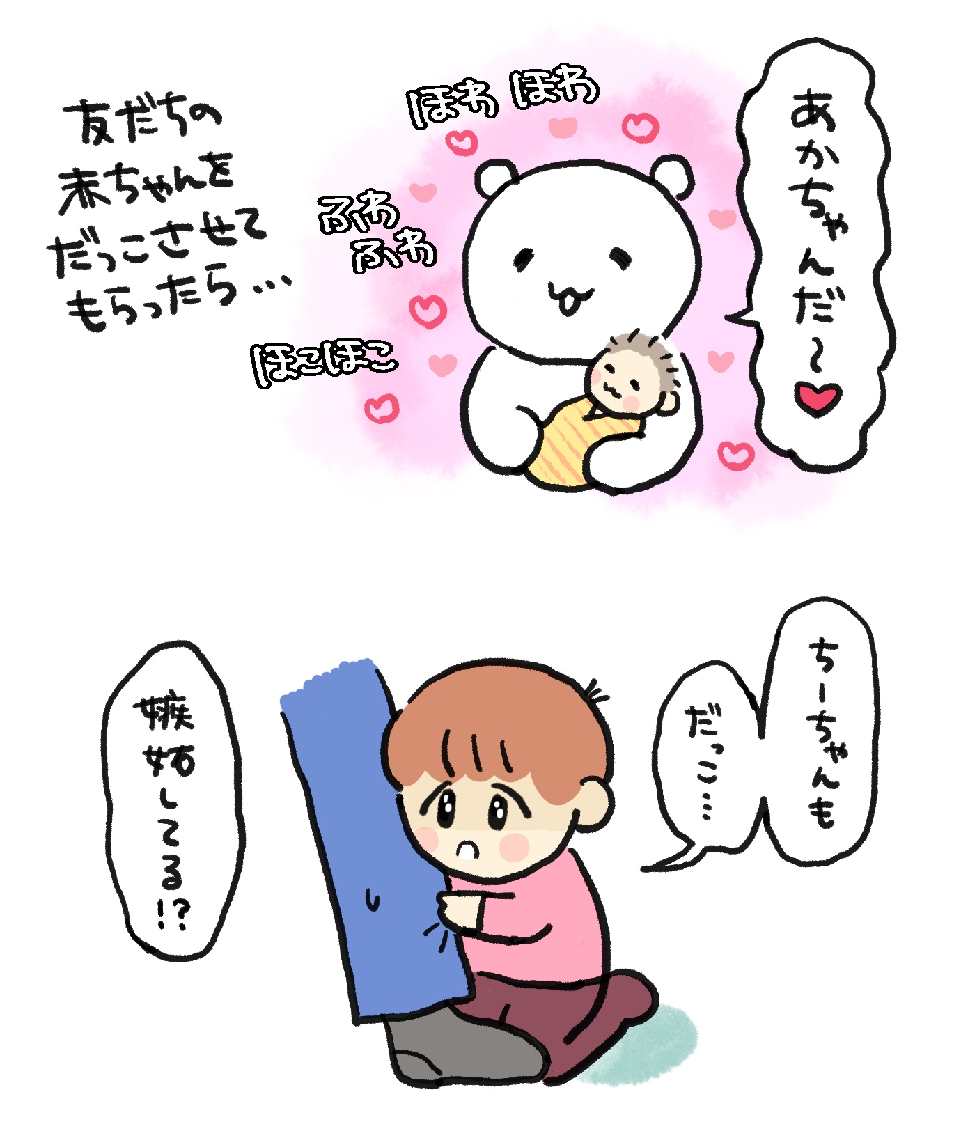 あまりの可愛さと軽さにデレデレしていると、ちーちゃんが脚に抱きついて「ちーちゃんもだっこ……ちーちゃんだっこしたいの……」と切なそうな表情で話しかけてきました。