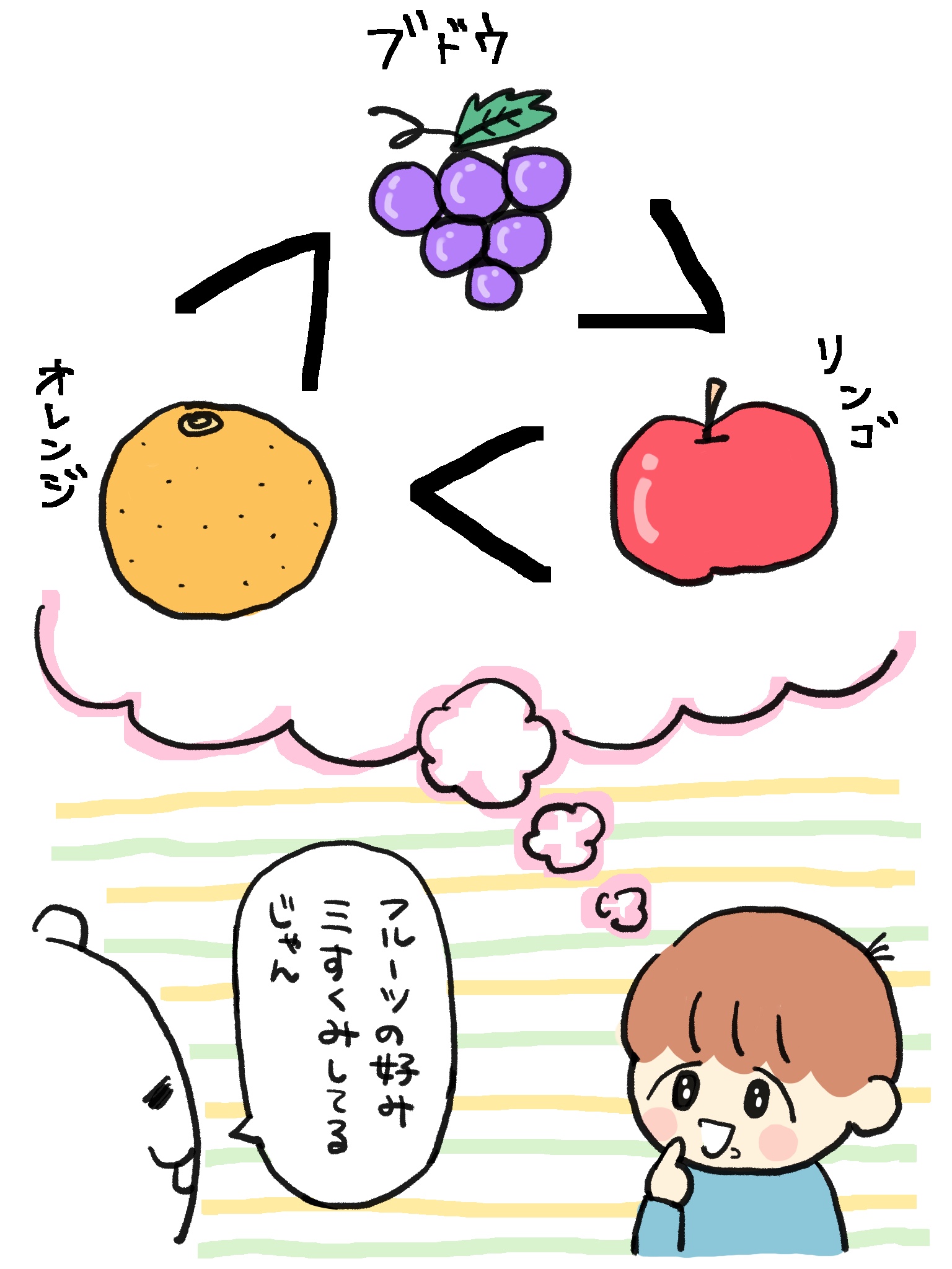 オレンジ>ブドウ>リンゴ>オレンジ!